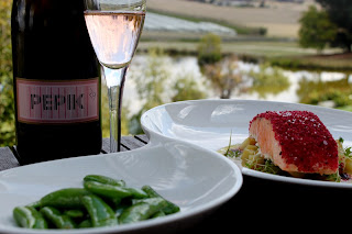 A relaxing lunch of Beetroot-crusted Ocean Trout and Josef Chromy Sparkling Blush in the winery restaurant. |